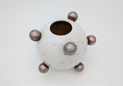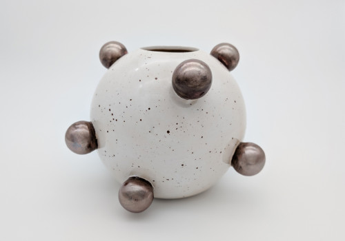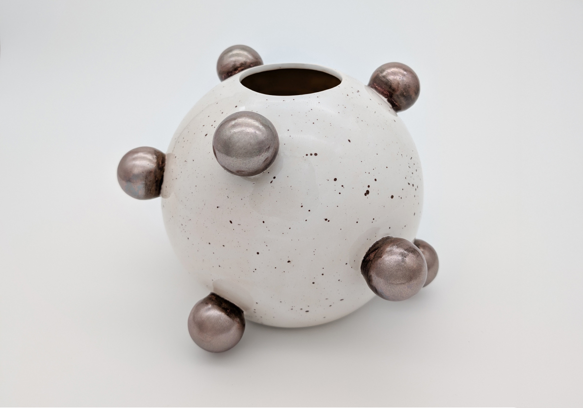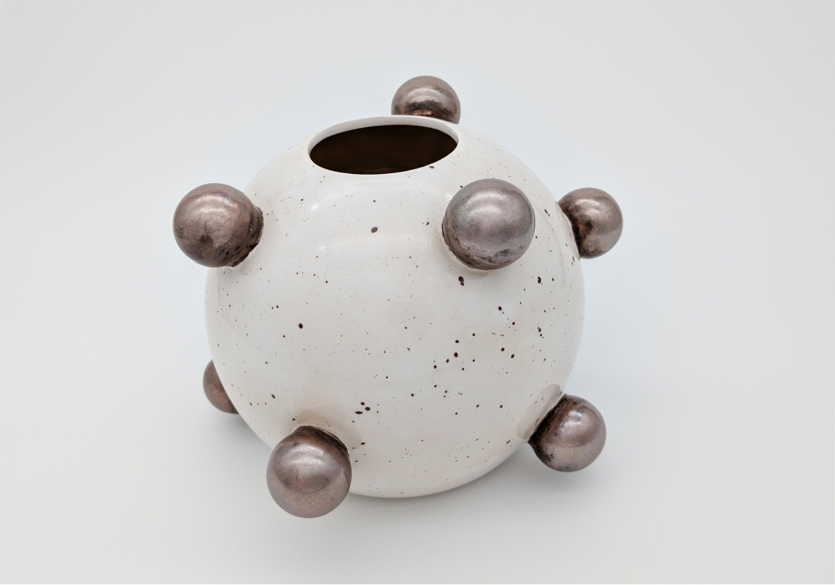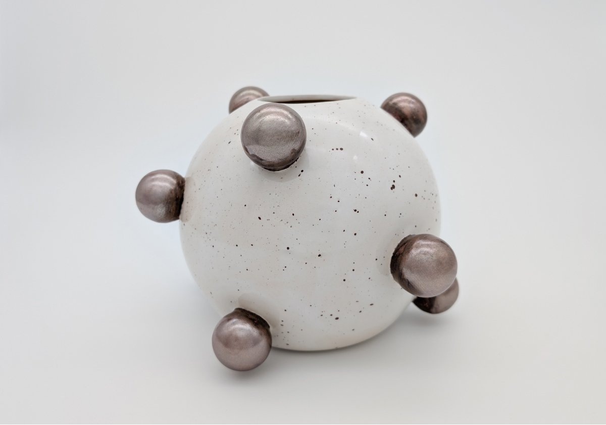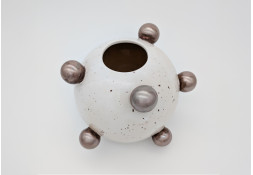 Ręcznie wykonany wazon ceramiczny zachwyca odważną formą i kontrastem barw. Biała, nakrapiana powierzchnia została ozdobiona metaliczno-złotymi kulami, które nadają całości nowoczesny, rzeźbiarski charakter. Jest to unikatowy egzemplarz — tworzony w małej pracowni z dbałością o detal i naturalne piękno ceramiki.