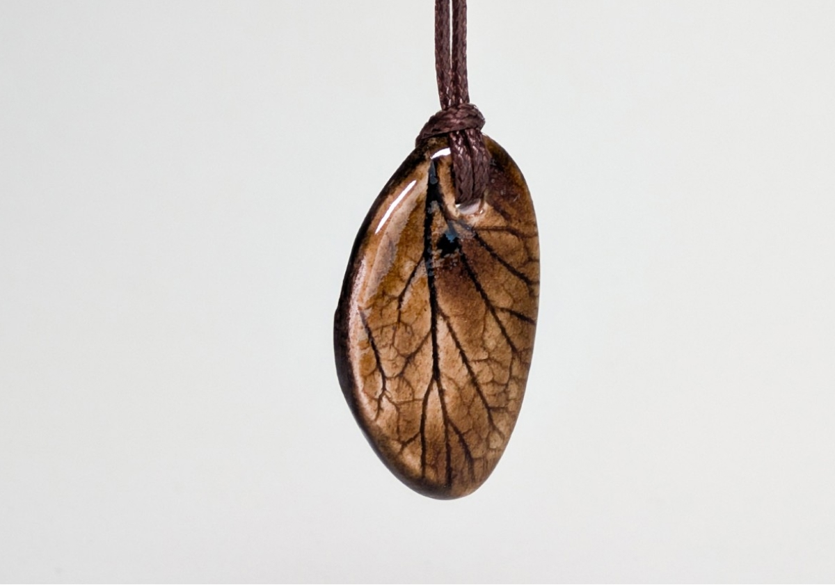 Ręcznie wykonany wisiorek ceramiczny w kształcie liścia to unikatowy dodatek inspirowany naturą. Każdy egzemplarz powstaje w pracowni artystycznej, dzięki czemu różni się od pozostałych subtelnymi detalami i odcieniami szkliwa. Delikatne odwzorowanie struktury liścia podkreśla organiczny charakter biżuterii.