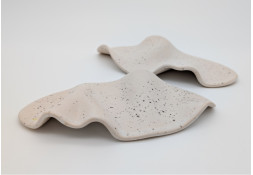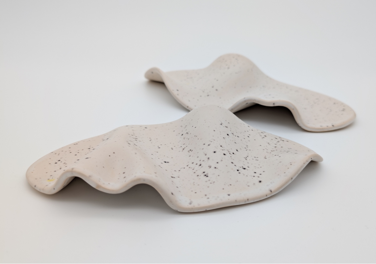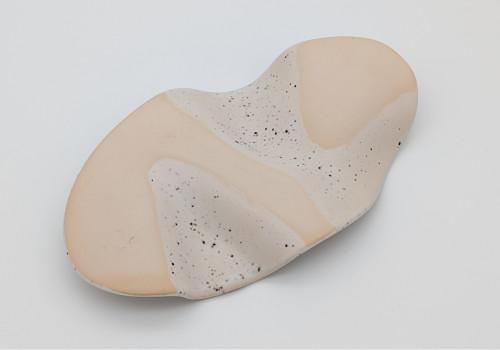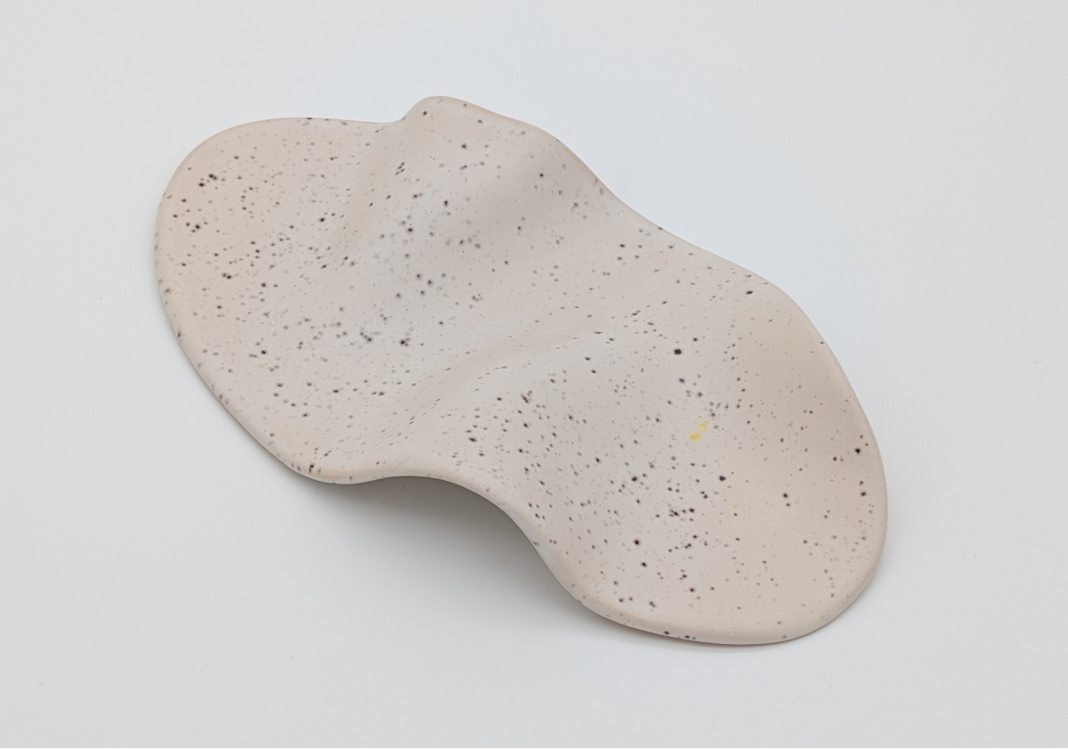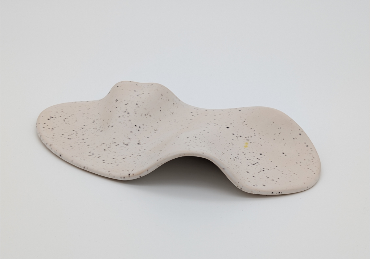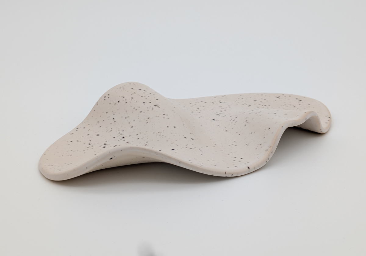 Rzeźbiarska patera o płynnych, organicznych kształtach. Powierzchnia pokryta jedwabistym, matowym szkliwem w odcieniu ciepłej bieli z delikatnym, czarnym nakrapianiem. Każdy egzemplarz powstaje ręcznie, dzięki czemu zachowuje niepowtarzalną formę i subtelną niedoskonałość, która nadaje mu charakter artystycznego obiektu.