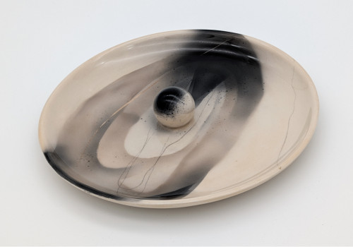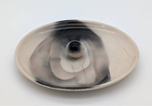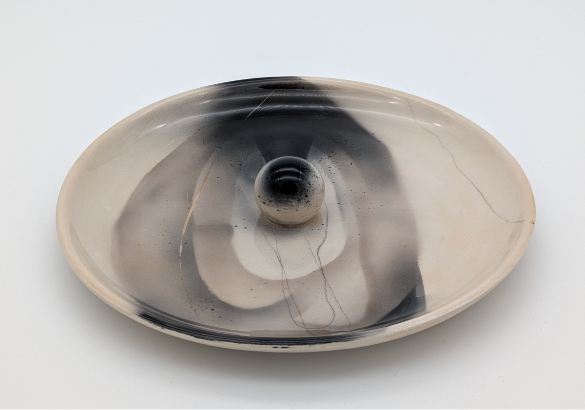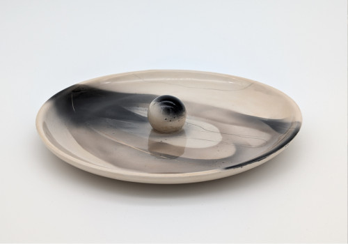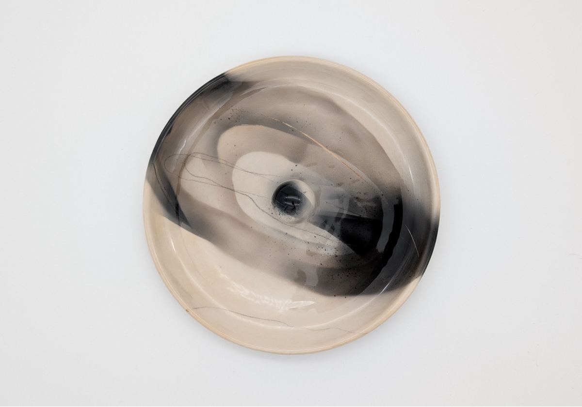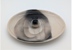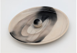Talerz ceramiczny o prostej, rzeźbiarskiej formie z kulą umieszczoną centralnie. Utrzymany w odcieniach beżu, szarości i czerni, z miękkimi przejściami barw i płynnymi rysunkowymi liniami. Powierzchnia szkliwiona, gładka, z połyskiem. Świetnie sprawdzi się jako dekoracja stołu, patera na przekąski lub mini drobiazgi. Naczynie przeznaczone do bezpośredniego kontaktu z żywnością.