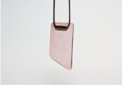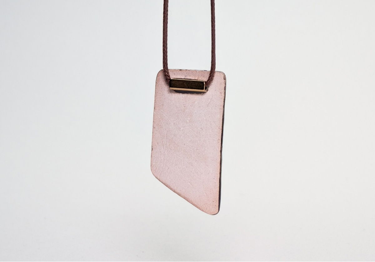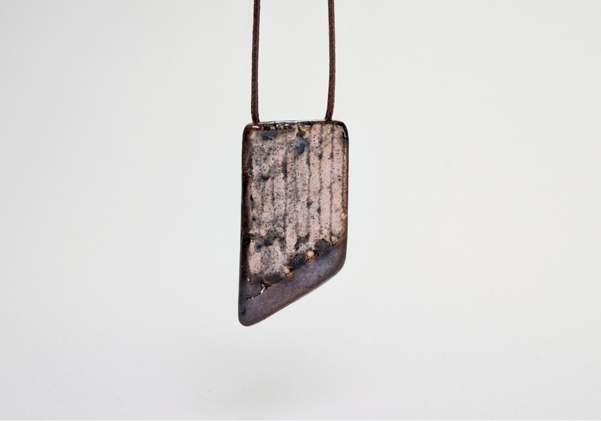 Ręcznie wykonany wisiorek ceramiczny o prostokątnej, lekko ukośnej formie. Powierzchnia ma subtelny rysunek pionowych pasów i nieregularne przebarwienia w odcieniach beżu, brązu i grafitu. Szkliwo delikatnie odbija światło, tworząc efekt surowej elegancji.
