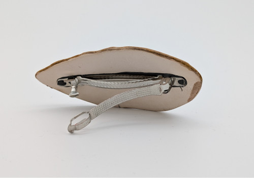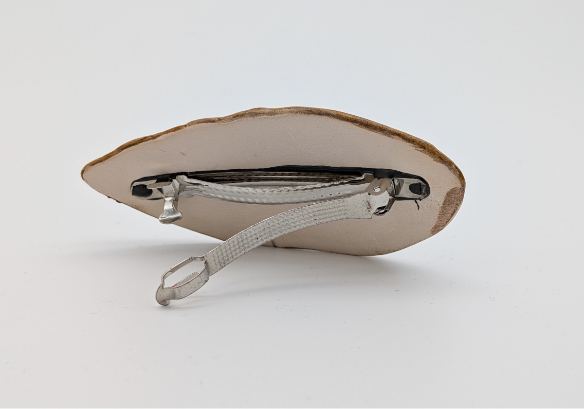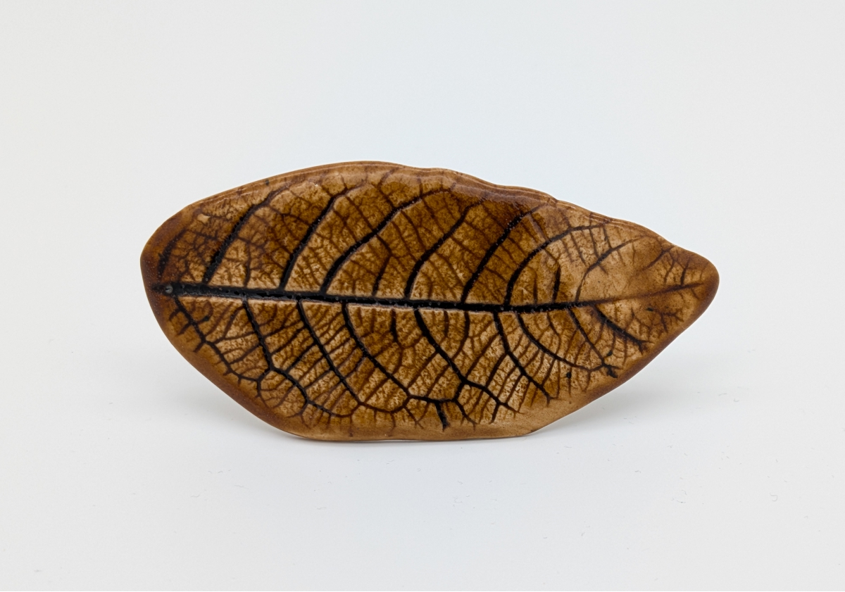 Ręcznie wykonana spinka ceramiczna w kształcie liścia. Pokryta szkliwem w odcieniu ciepłego brązu z wyraźnym, ciemnym rysunkiem nerwów, który podkreśla naturalną strukturę formy. Powierzchnia jest gładka, z delikatnym połyskiem.