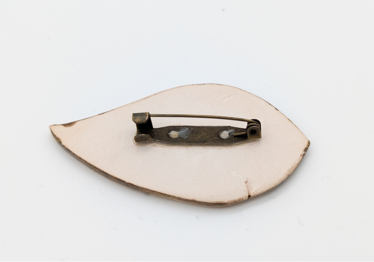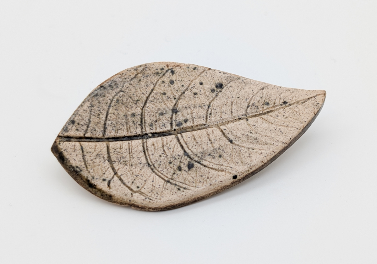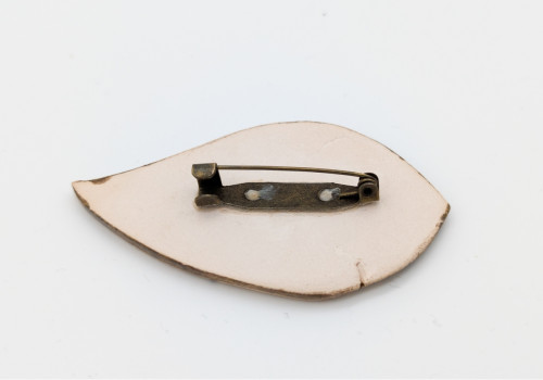 Ręcznie wykonana broszka ceramiczna w kształcie liścia. Pokryta jasnym szkliwem w odcieniach beżu z delikatnym nakrapianiem i rysunkiem nerwów, który podkreśla naturalną strukturę formy.