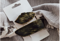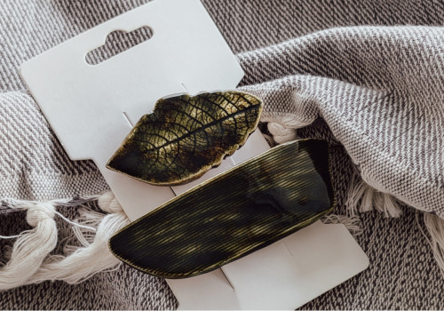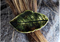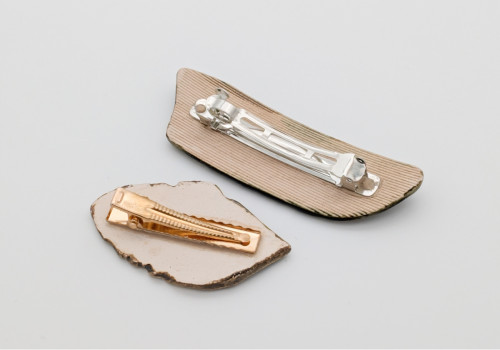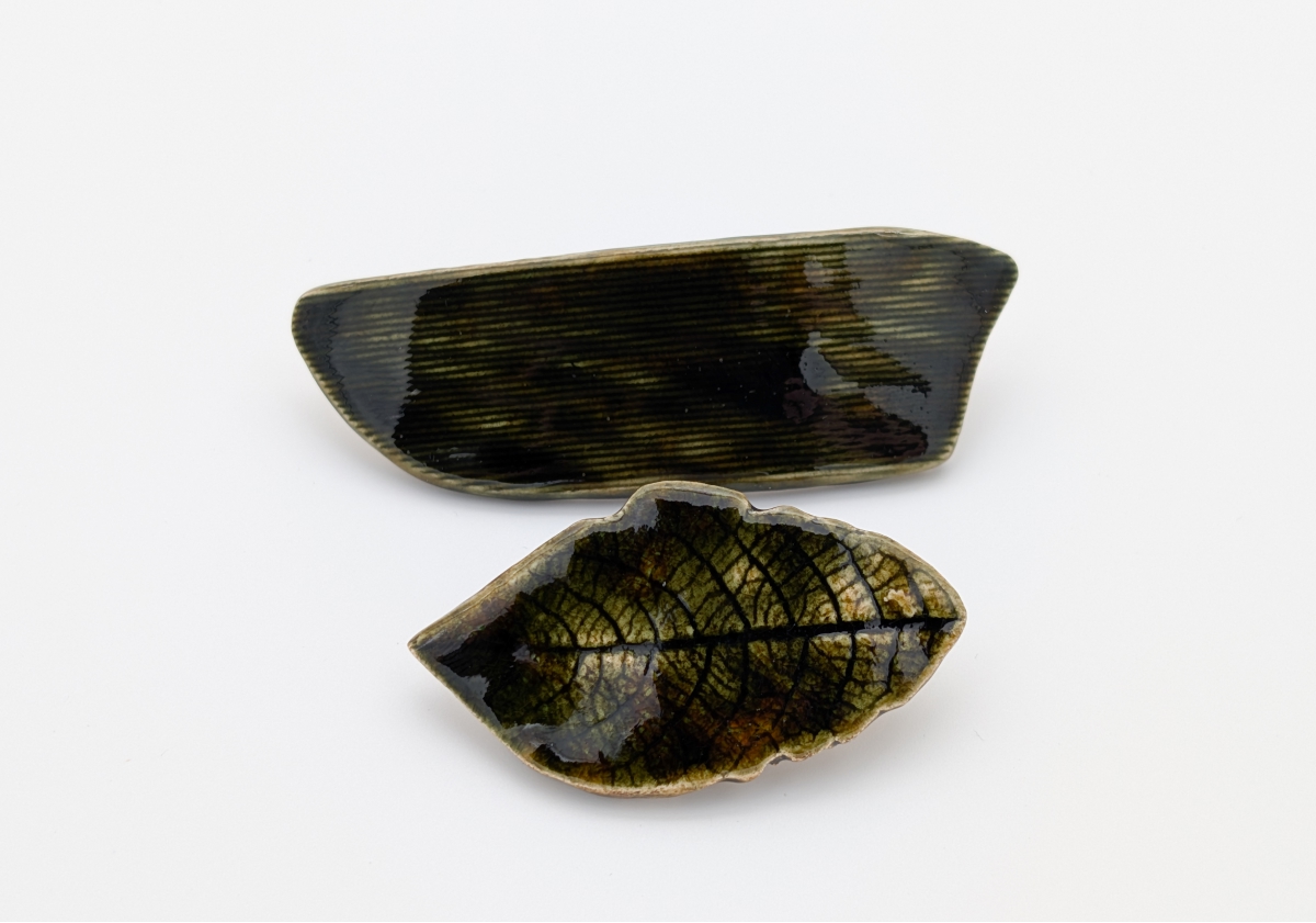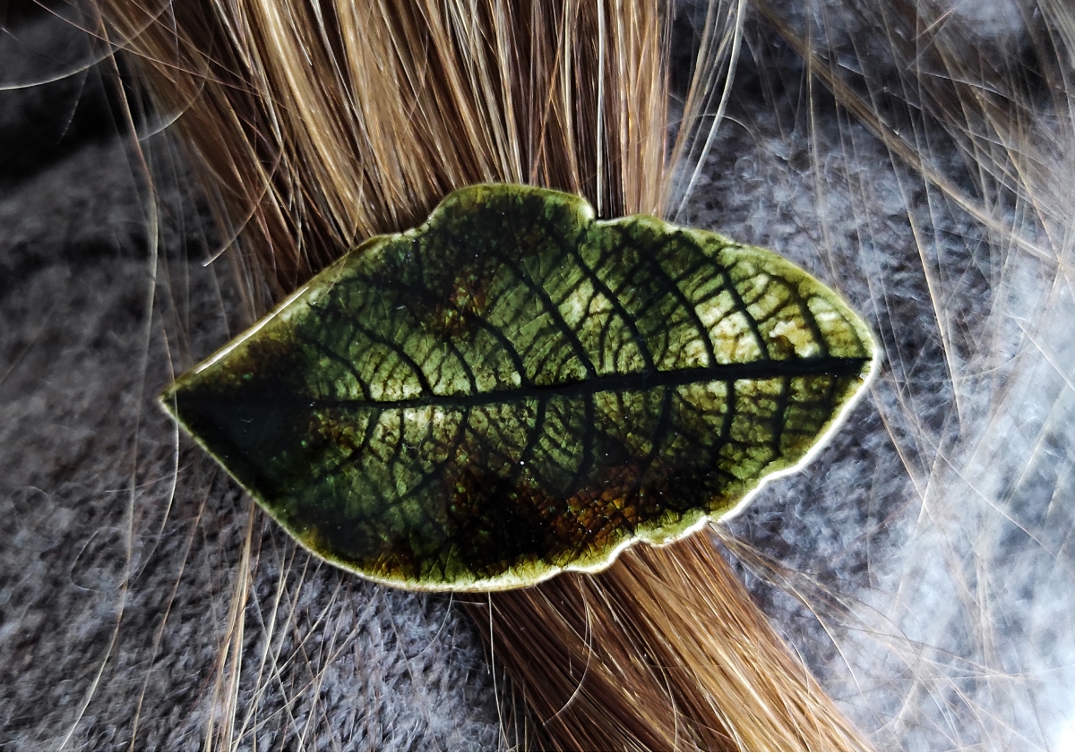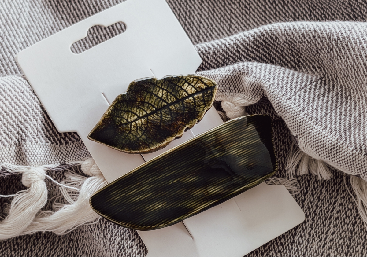 Unikatowe spinki ceramiczne, ręcznie wykonane z gładkiej, jasnobeżowej gliny, szkliwione, dwukrotnie wypalane w piecu ceramicznym. Zestaw zawiera dwie spinki w kolorze głębokiej, ciemnej zieleni. Wymiary: większa — ok. 8 cm x 2,5 cm; mniejsza w kształcie listka — ok. 5,5 cm x 3 cm. Długość metalowych spinek: 5 cm i 4 cm.
