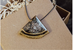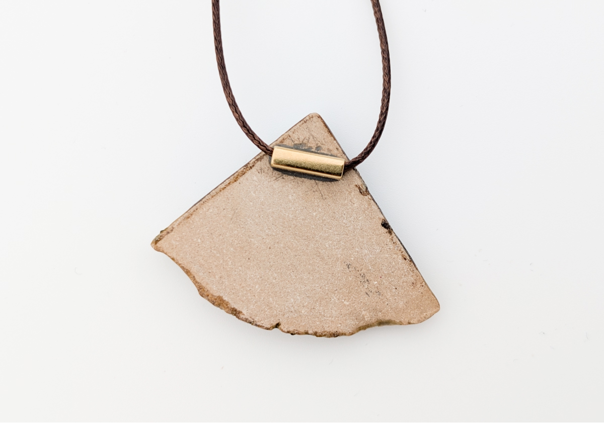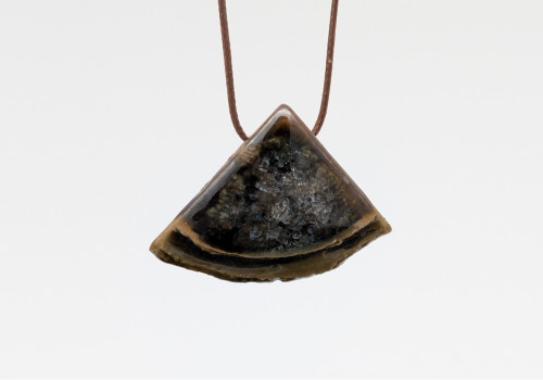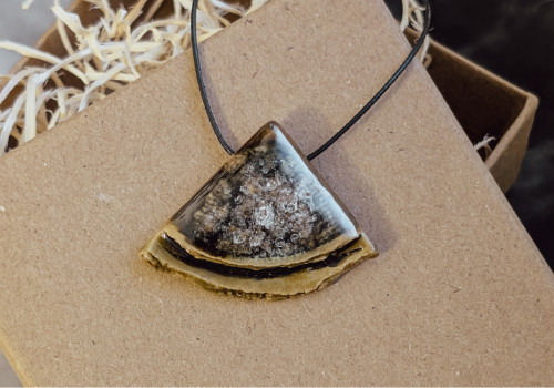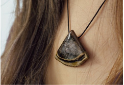 Unikatowy wisiorek ceramiczny o geometrycznej, trójkątnej formie z lekko zaokrągloną podstawą z dodatkiem szkła. Produkt ręcznie wykonany z gładkiej, jasnobeżowej gliny, szkliwiony, dwukrotnie wypalany w piecu ceramicznym.Wymiary ok. 3 cm x 4 cm.