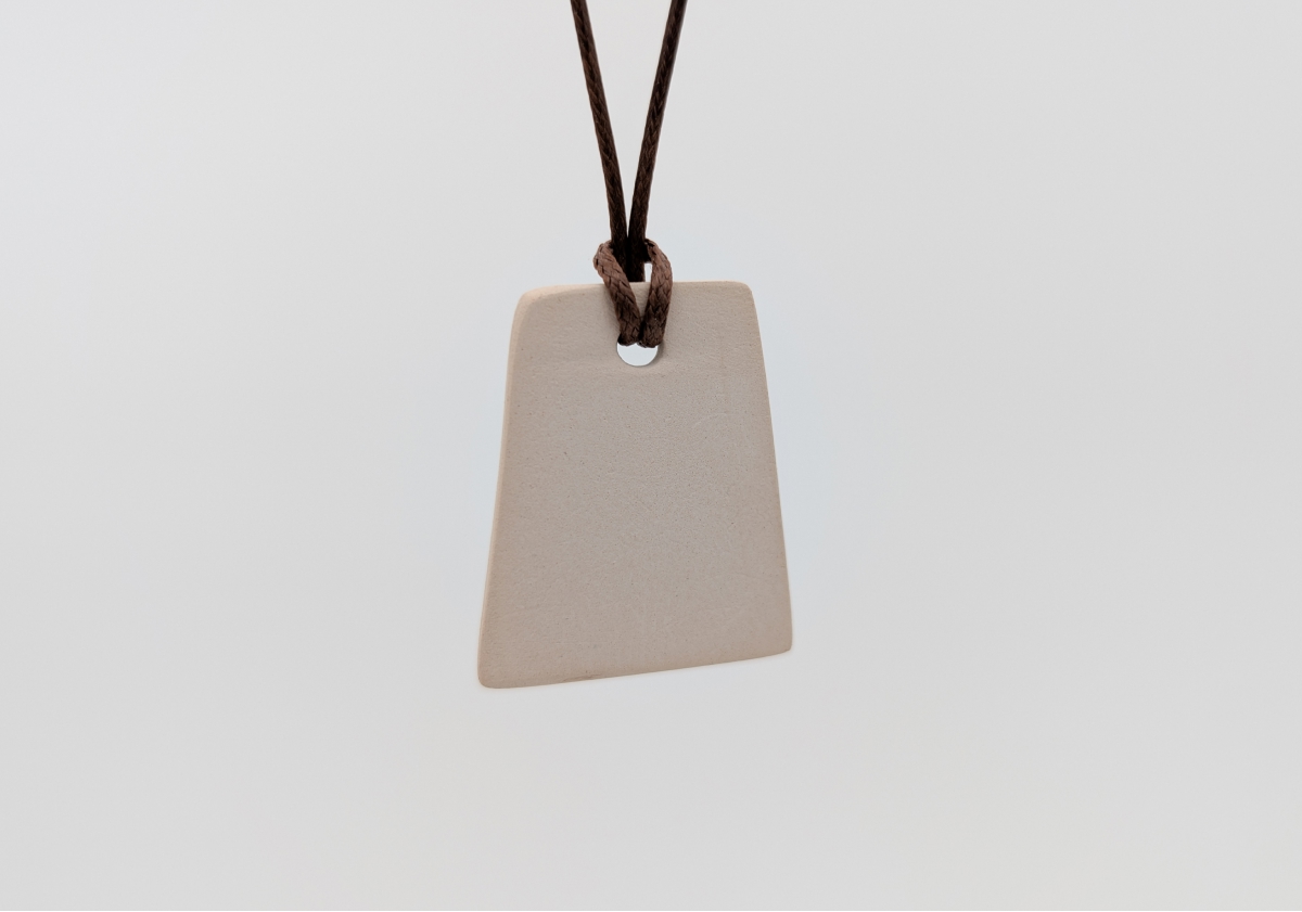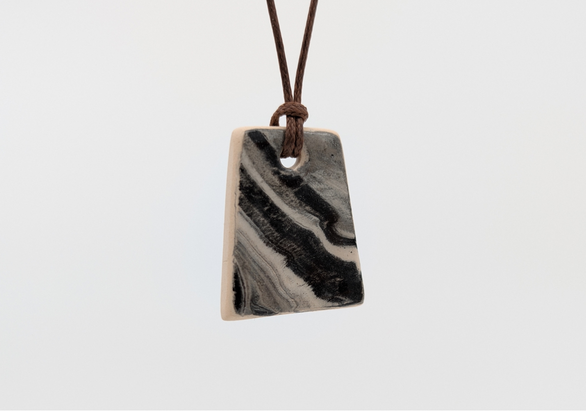 Ręcznie wykonany wisiorek ceramiczny o nieregularnej, geometrycznej formie. Powierzchnia w odcieniach beżu, bieli, szarości i czerni tworzy unikatowy rysunek przypominający kamień lub tuszowy pejzaż.Wymiary: ok. 2,5 cm x 3 cm
