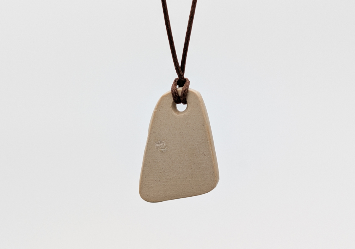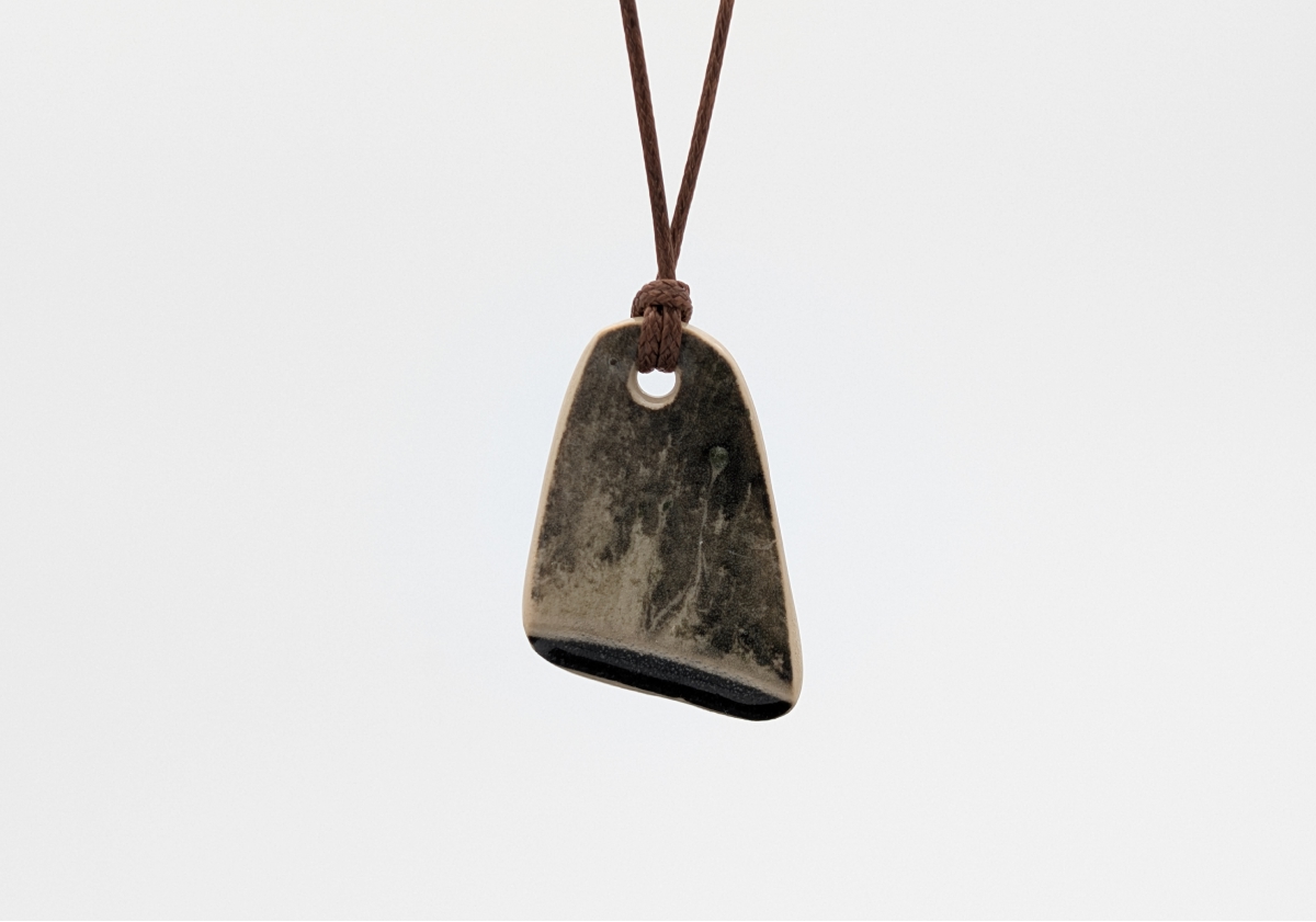 Ręcznie wykonany wisiorek ceramiczny o nieregularnej, geometrycznej formie. Powierzchnia w odcieniach beżu, bieli, szarości i czerni tworzy unikatowy rysunek przypominający kamień lub tuszowy pejzaż.