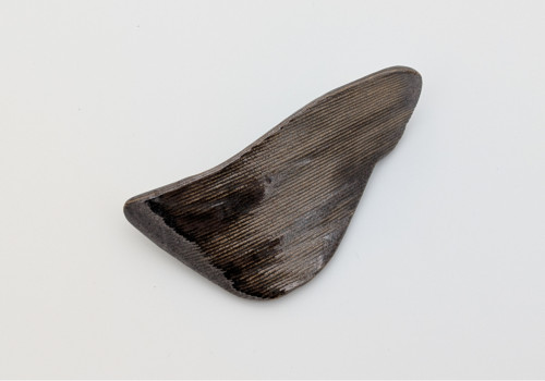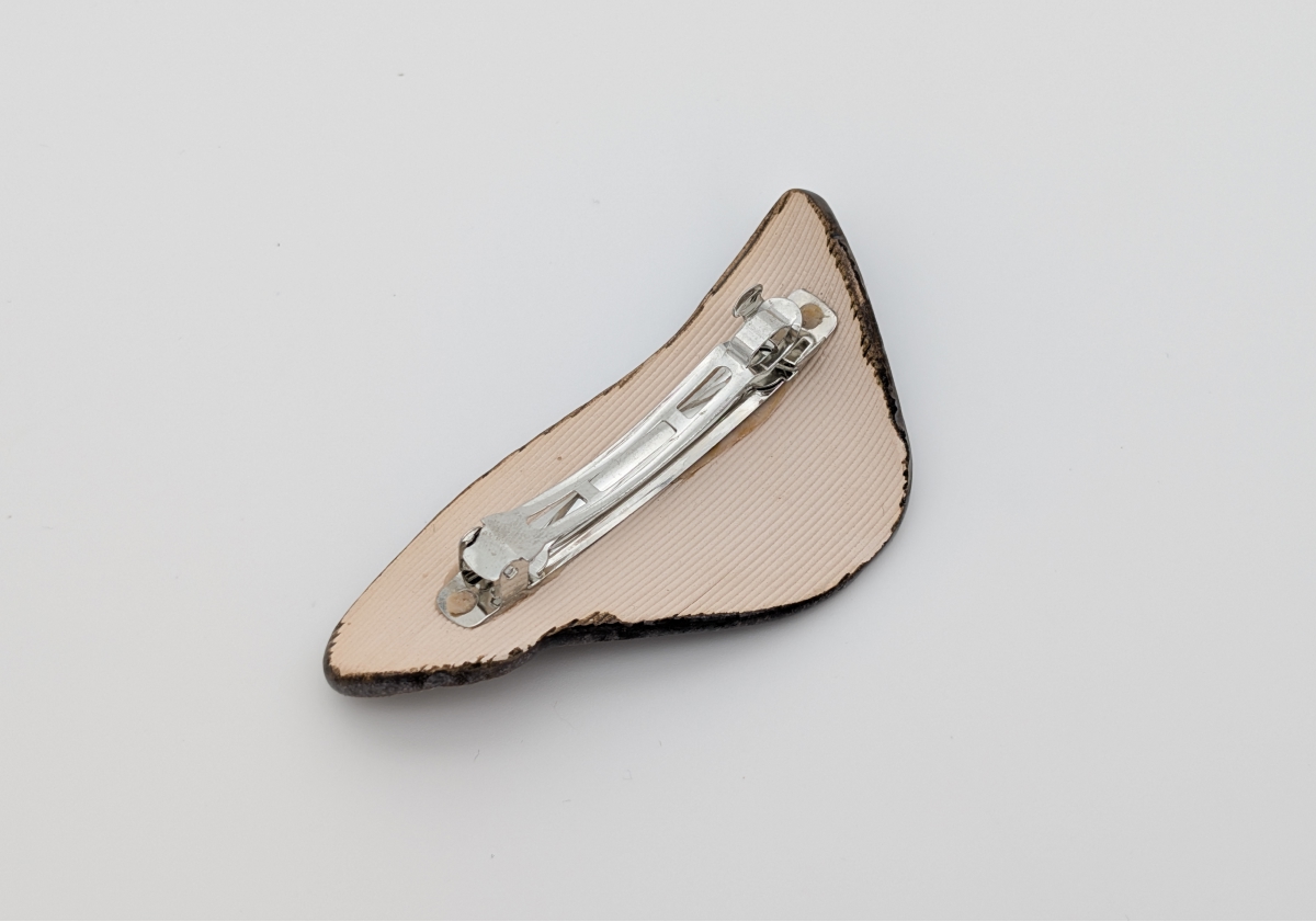 Ręcznie wykonana spinka ceramiczna o asymetrycznej formie. Jej powierzchnia pokryta jest cienkimi, równoległymi żłobieniami, które nadają całości subtelną strukturę. Ciemnobrązowe szkliwo z metalicznym połyskiem przechodzi w jaśniejsze tony ziemiste, podkreślając naturalny charakter materiału.